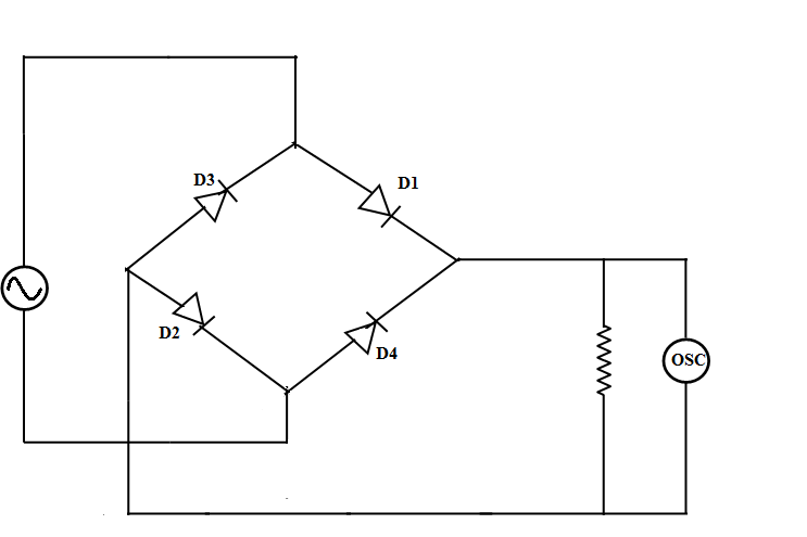 - Channel 1 shows the input sine waveform, Channel 2 shows the output rectified waveform.